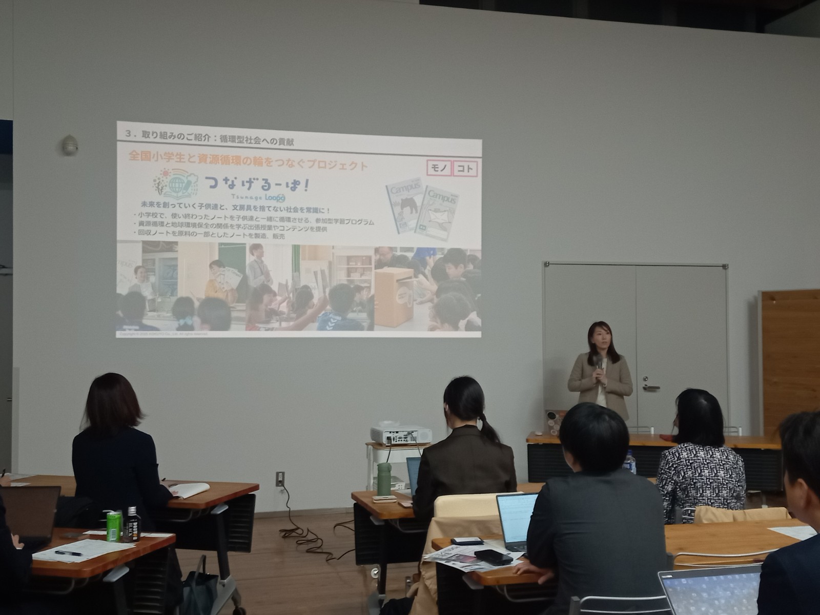 続いて、コクヨ株式会社よりサステナブル経営の実践についてお話をいただきました。コクヨではCSRではなくCSVの考え方を重視しており、顧客価値だけでなく社会価値の創出に焦点を当てて取り組んでいるとのことです。モノだけでなく、コトやライフスタイルまで含めて社会をどう変えていきたいかを考え、「人と社会と地球のwell-being」を実現する事業活動を進めているという説明がありました。具体的には、社会に流通した製品へのアプローチとして「SUTENAI CIRCLE(捨てないサークル)」を進めており、例えばクリアファイルの回収を家具事業につなげるなど、グループ全体で資源循環に取り組んでいるとのことです。