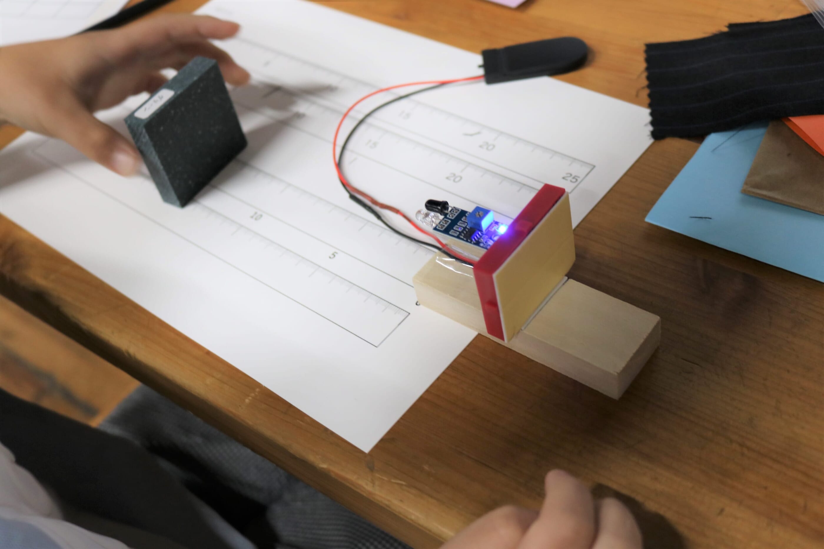 最初に、バイオミメティクスの技術例について、クイズを交えて紹介がありました。例えば、新幹線の先頭の形は、カワセミのくちばしの形が参考にされています。これにより、トンネルに進入する際の抵抗が減り、騒音を防ぐことができます。このように生きものから様々な形や能力を取り入れ、技術開発に役立てることがバイオミメティクスです。その後、コウモリが超音波を使い、反射した音(エコー)で周囲の環境を把握していることを学びました。コウモリが音の反射を感じることができるセンサーの能力に関連して、実験では、赤外線センサーを使い、紙や布などの様々な種類の物の反射しやすさを調べました。
