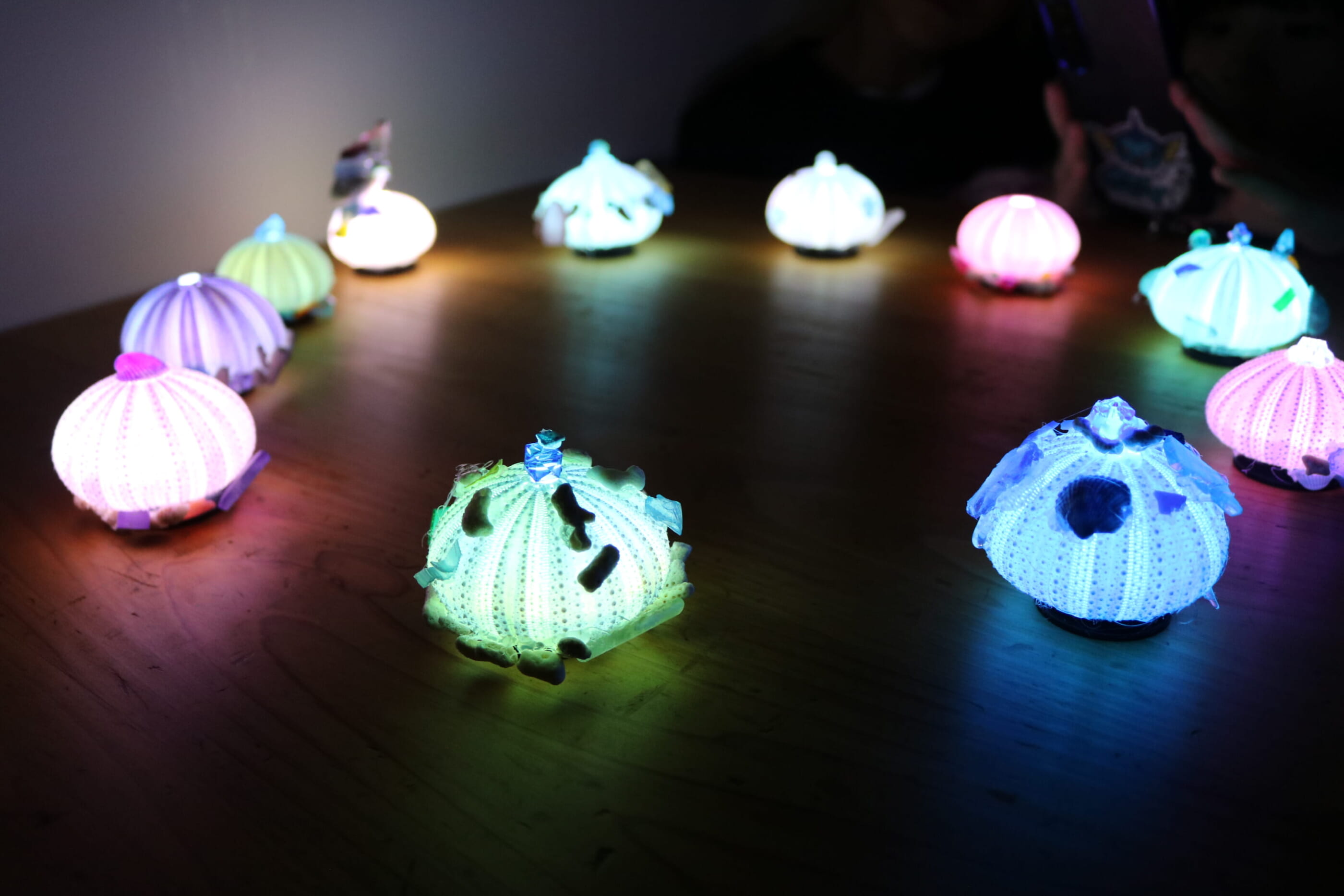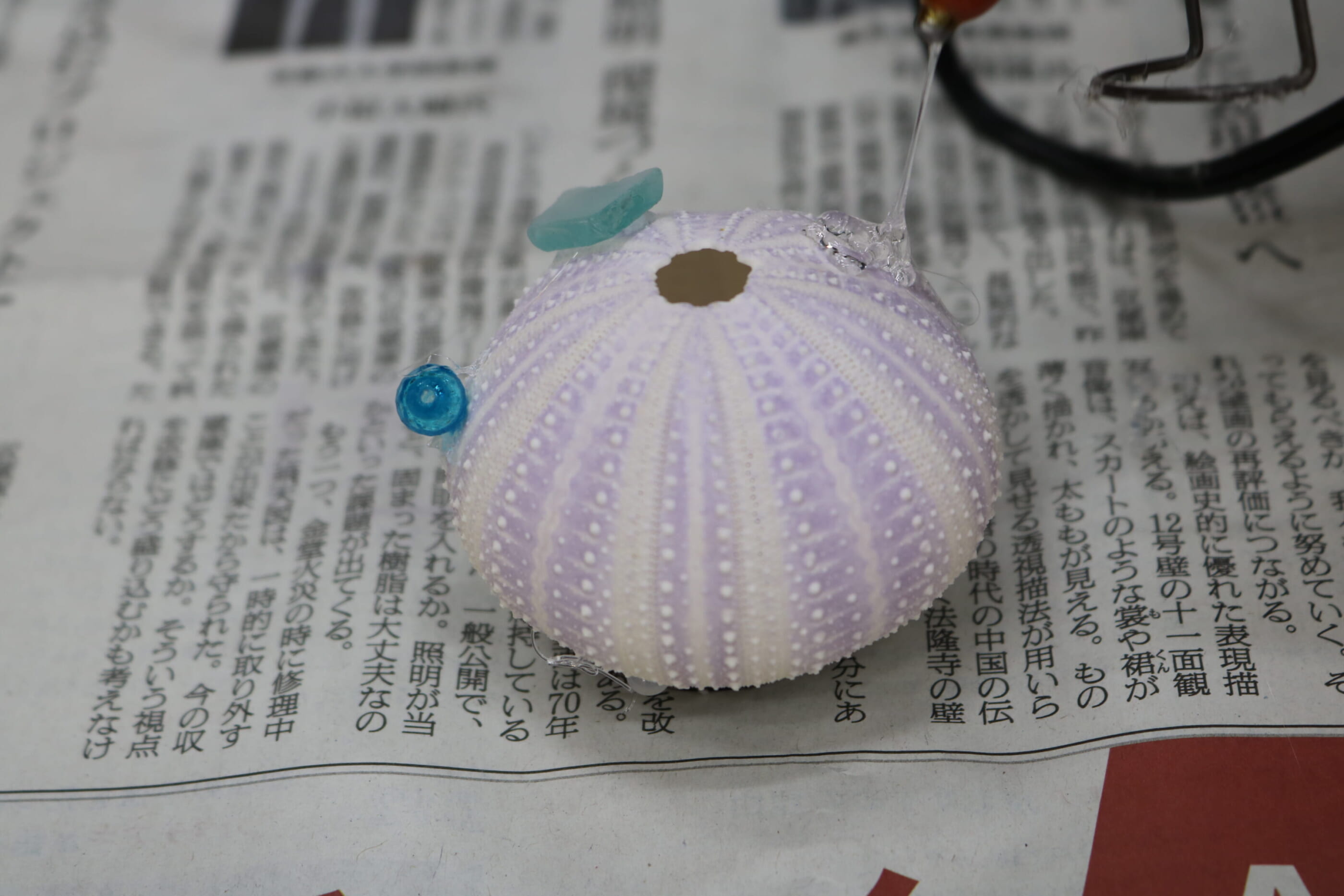 最初に、海洋プラスチック問題について説明がありました。海の生物多様性を守るために海洋ごみを減らすことが重要であること、そのためには私たちが少しずつプラスチック製品の使用を減らすことが大切であると説明がありました。次に、ウニの生態について説明がありました。ウニはヒトデなどの仲間である棘皮(きょくひ)動物であることや、トゲは筋肉で付いているため、死ぬと簡単に取れることを学びました。ワークショップでは、本物のウニの殻にシーグラスやサンゴなどの装飾をつけ、オリジナルのランプを作りました。