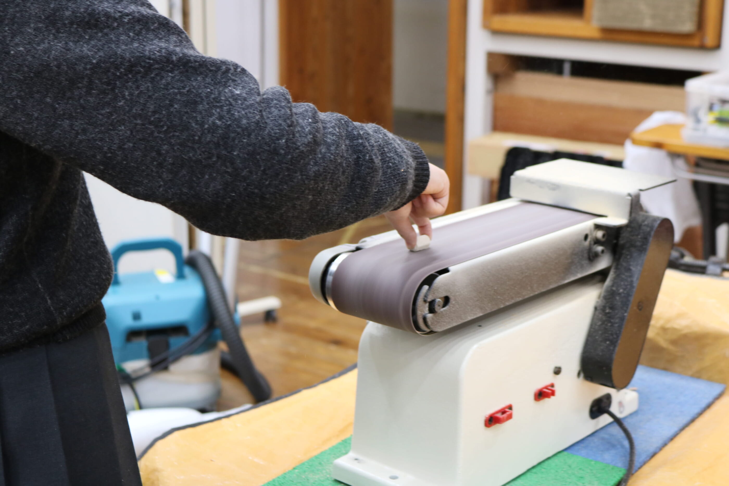 素材を並べ替えてデザインの方向性を固めたり、切り出した木材をヤスリがけして滑らかにしたり、穴を開けたりするほか、木糸を結ぶ・通す・編むといった細かな作業も進められました。