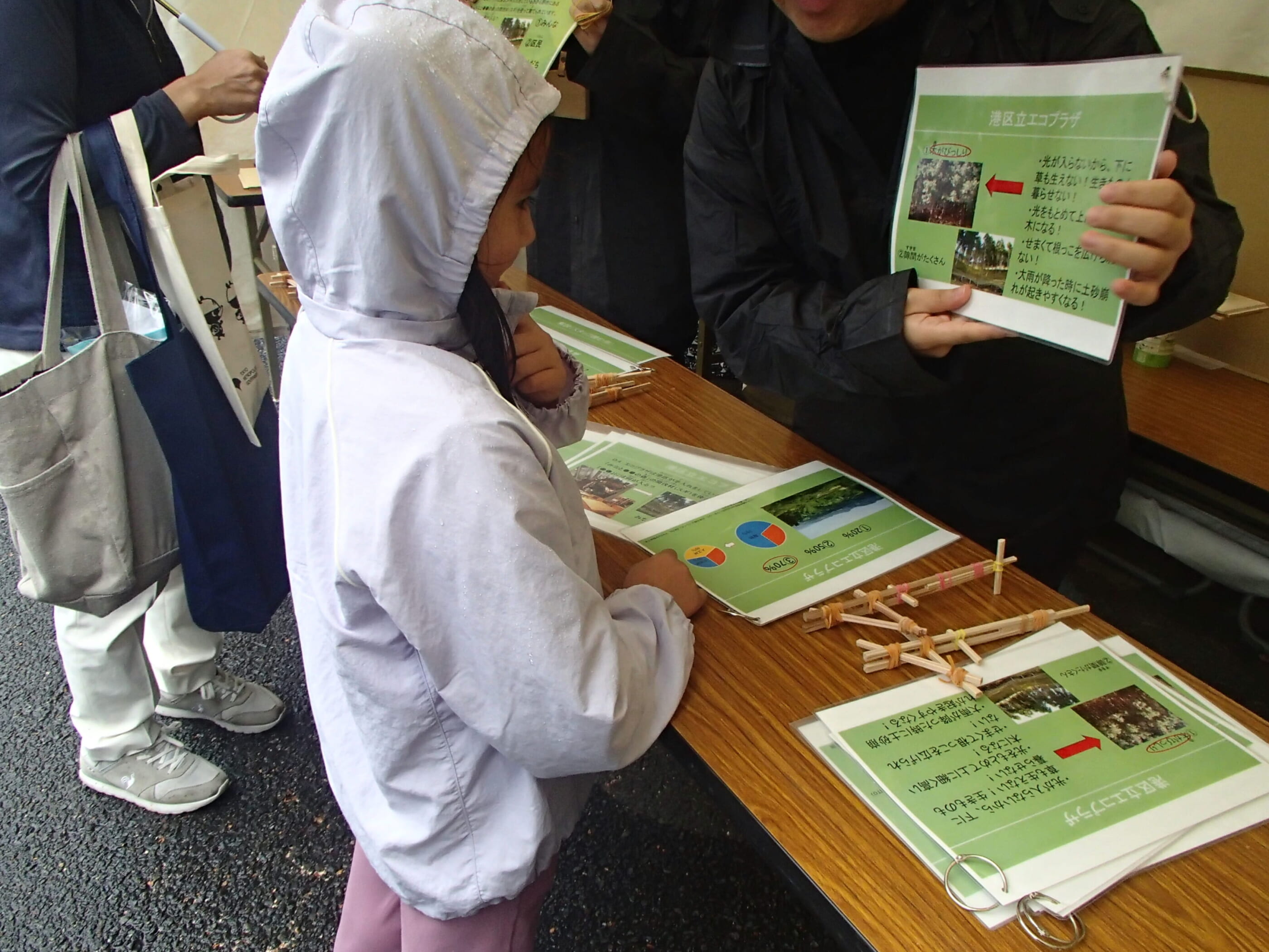 最初に、日本の森の現状やみなと区民の森などに関するクイズを出しました。また港区内にある国産材を使用した建物、みなとパーク芝浦や高輪ゲートウェイ駅、エコプラザの紹介をしました。間伐材から生まれた割りばしで作成したゴム銃を使い、森に見立てた紙コップを倒す射的体験を行いました。参加賞として、国産材のブナやタモ、カツラなどを使ったクリップをプレゼントしました。