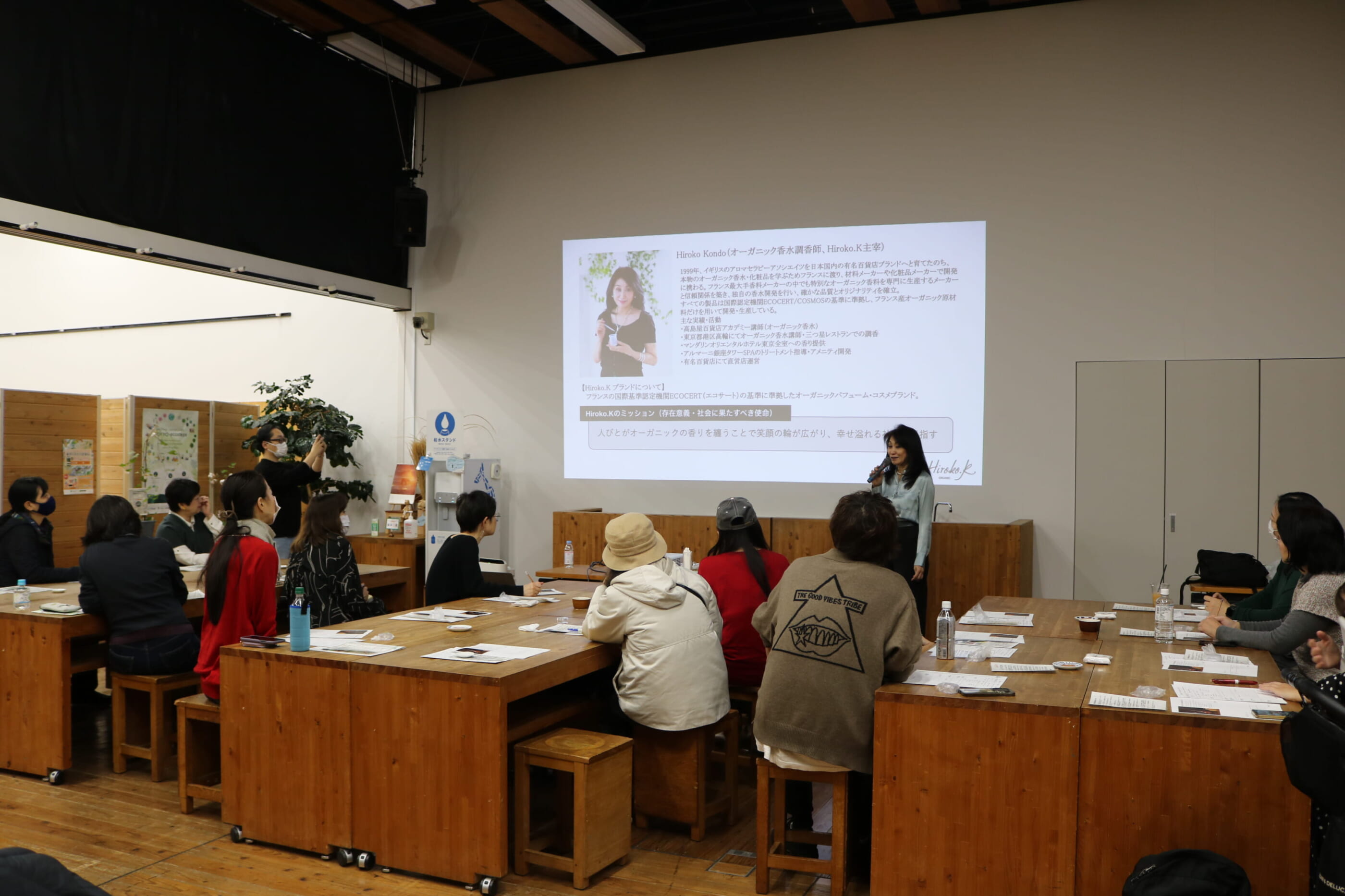 最初に、オーガニックや自然由来の香り・コスメなどを取り入れることによる環境への影響について話がありました。農薬や化学肥料を使わないことで土壌・水への負担が軽減され、生態系を守ることにつながります。また、天然の香りは日々のストレス緩和や心の切り替えに機能的に働きかけることに加え、自分の体や心にやさしいものを選択をすることが、暮らし全体を整えることにつながると説明がありました。