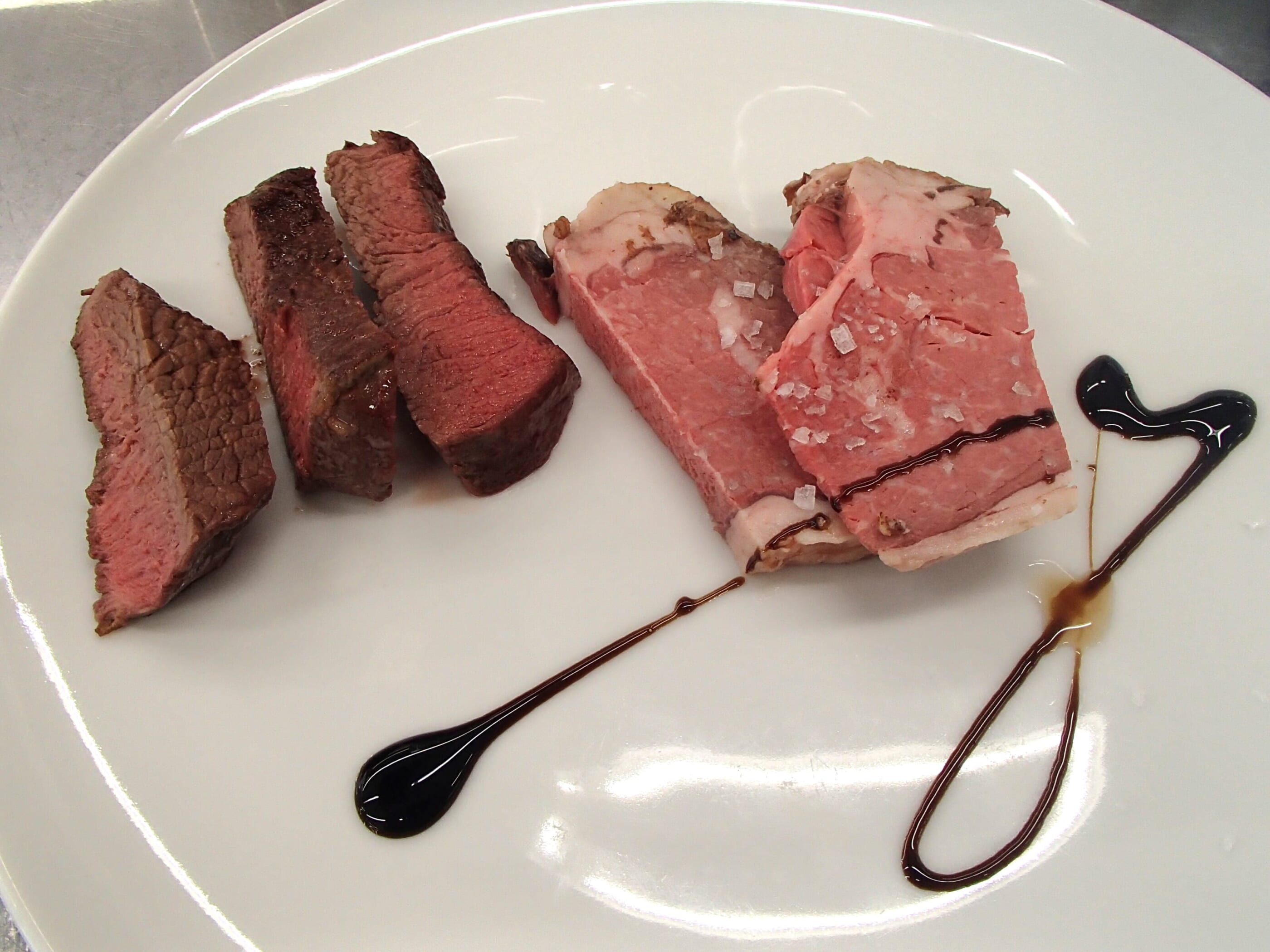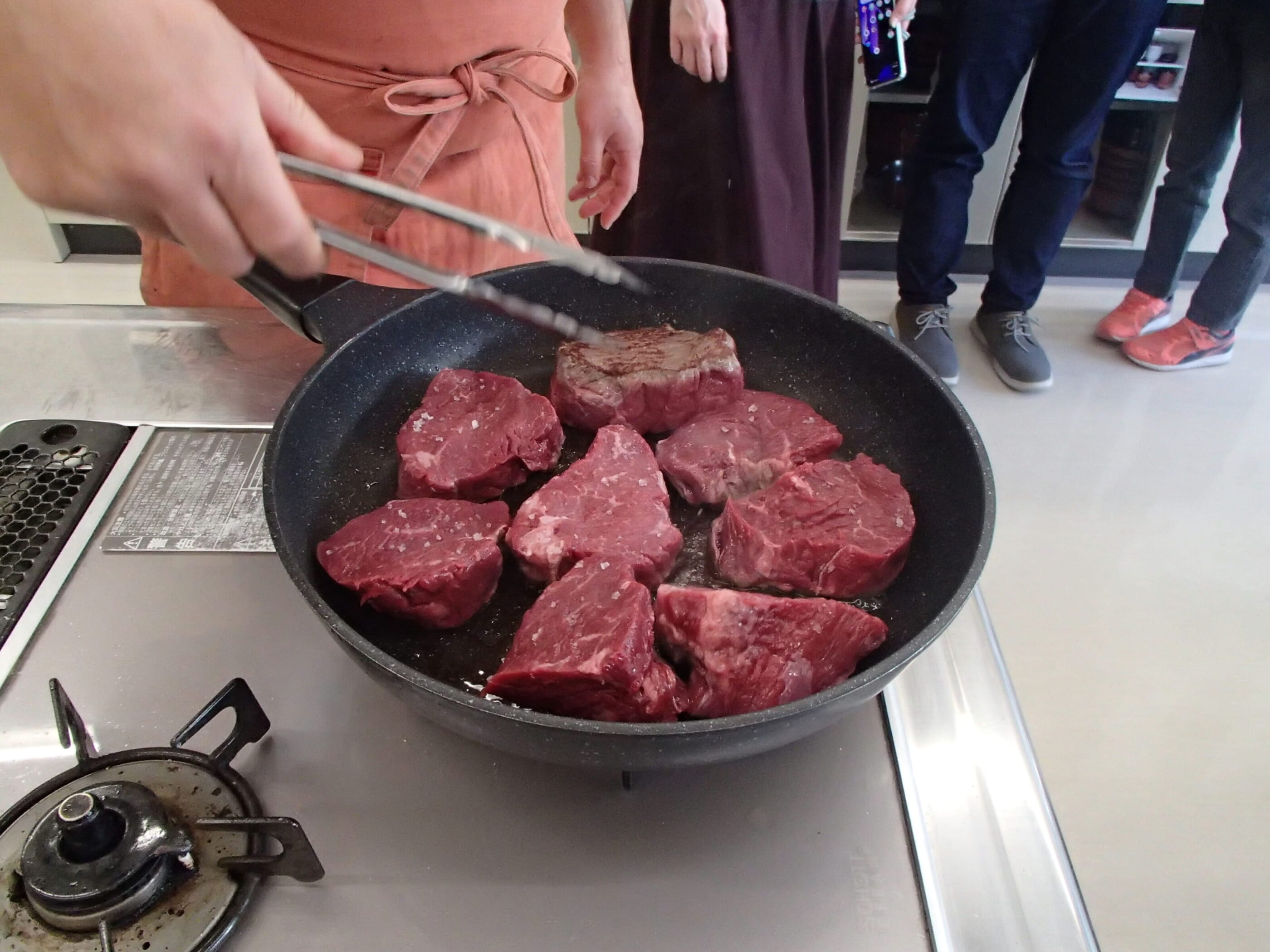 大野氏の話の後に、焼く時の温度や時間などの説明を聞きながら調理の様子を見学し、2種類の部位の肉を試食しました。調理時での味付けはどちらも塩だけとのことです。また、湊氏からは調理をする時に無駄を出さないように全ての部分を使用することを大切にしているという話がありました。調理前の処理で切り分けたすじはスープなどに使うとのことです。