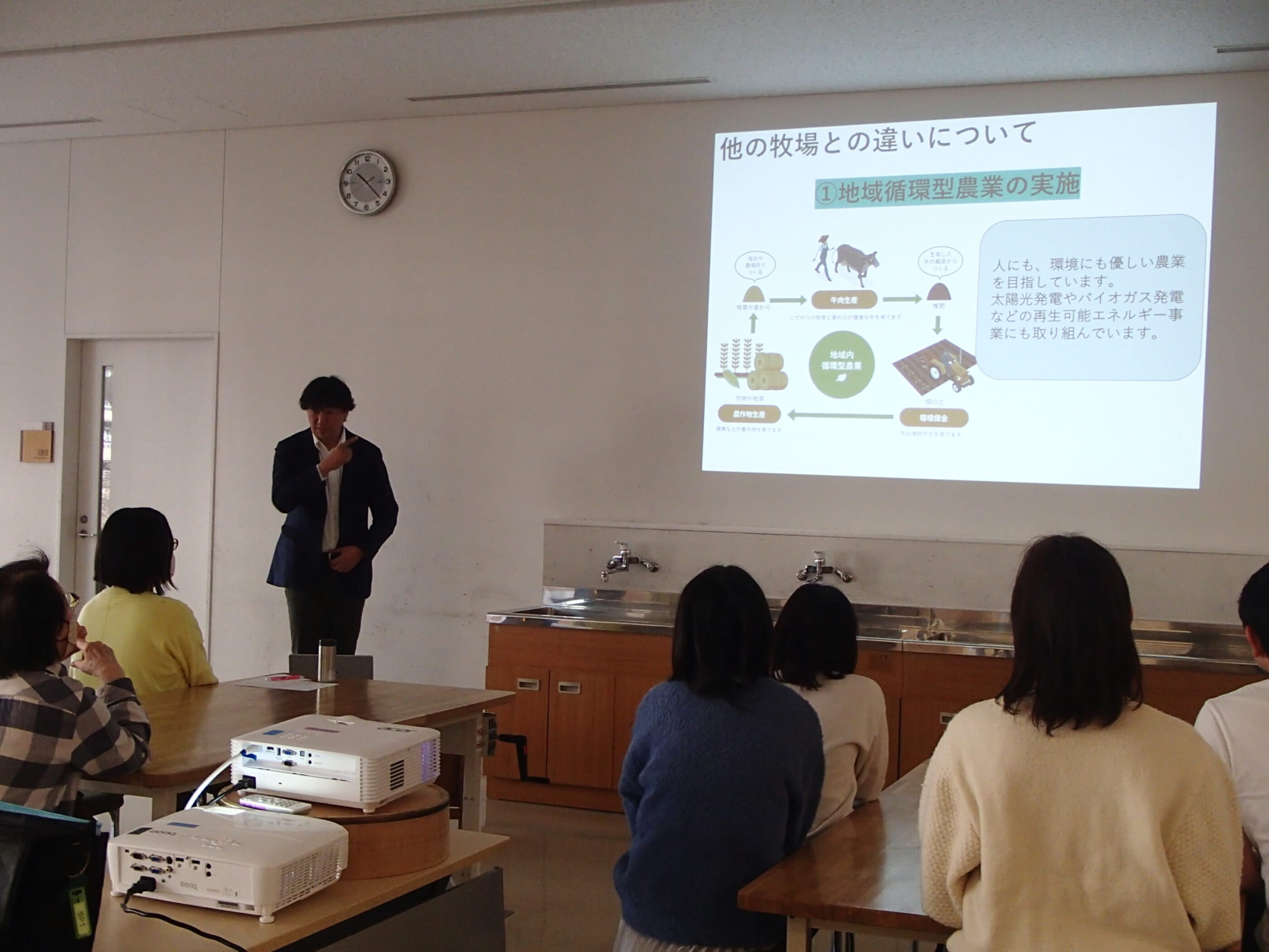 牛の飼育は成長状況によりエサのやり方を7パターン程度に細かく変えています。また、560ヘクタールの敷地を自由に動き回れる健康に配慮した環境で育て、抗生物質を使用せずHACCP(※)認証を取得しているとのことです。乳牛は雌が乳用牛、雄は肉用牛として飼育されますが、殺処分されることもあり、黒毛和牛と比べ安価です。また、メスだけが生まれるような技術も広がりつつあるとのことです。雌のようにミルクを出すことがなく、和牛に比べ安価な雄の乳牛ですが、命の重さは同じであり、大野ファームでは一頭一頭に責任を持って育てており、都会に住む人々が乳牛の雄の肉を選択することは北海道の酪農と畜産、そして日本の食を支えることにつながると説明がありました。