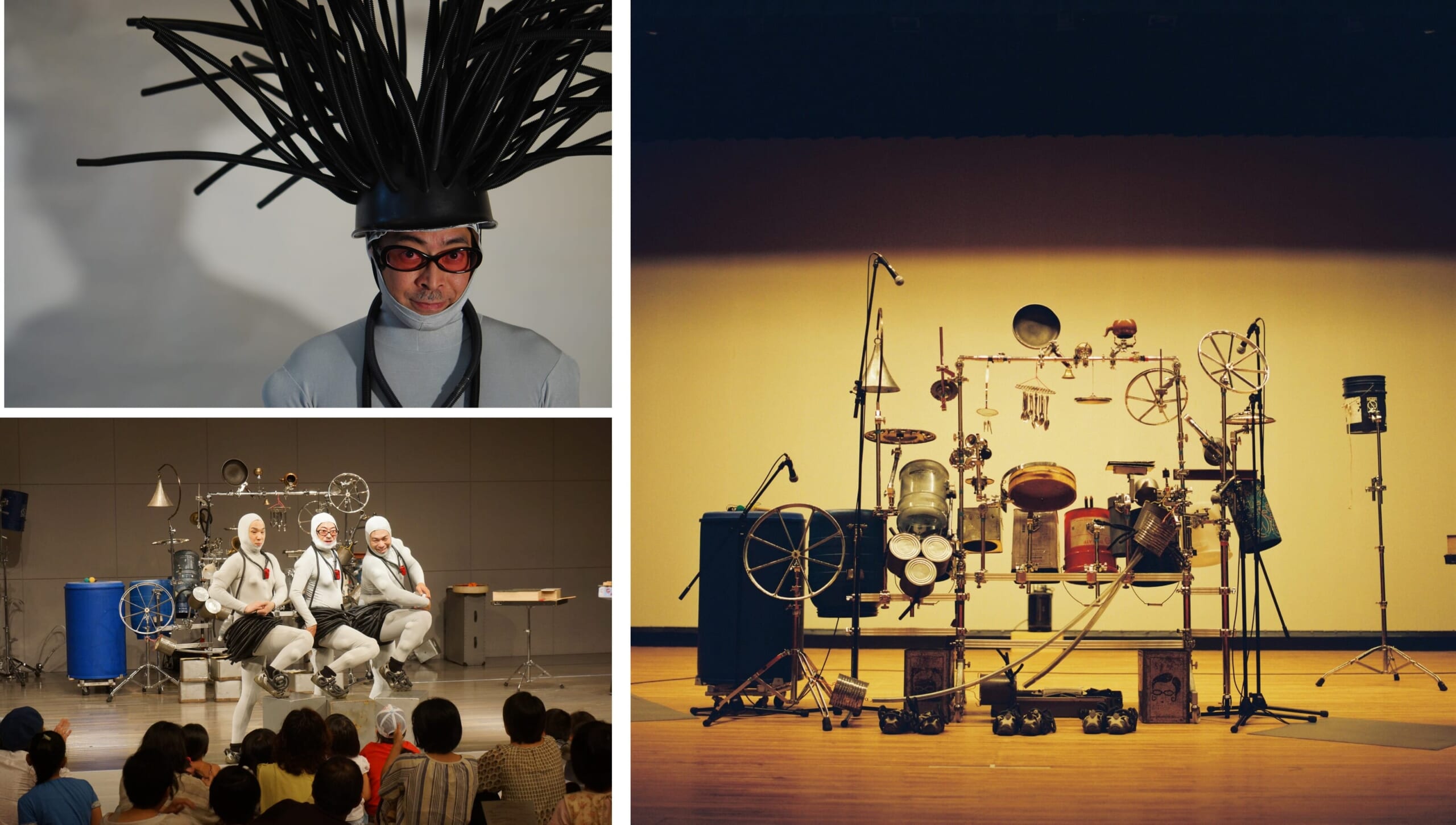 | 講師 | ティコボ(廃品打楽器グループ)![]() 【プロフィール】 日本廃品打楽器協会会長の山口とも率いる計3名の廃品打楽器グループ。 生活の中で増え続ける廃品から作った楽器を叩くスタイルで活動している。 場内練り歩きに始まり、何とも不思議な形をしたオリジナル打楽器の演奏、さらに観客参加型の演奏コーナーもあり。聴いて楽しい、見て楽しい! 幅広い年齢層の方にお楽しみいただける新感覚のパフォーマンスユニット。 |