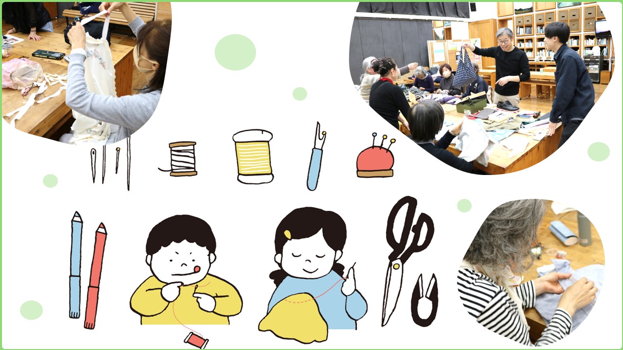 | 持ち物 | 修繕したい衣服等、リメイクしたい方はその素材、(持っている方は)使用する裁縫道具 ※以下の道具は貸出し可能です。 縫い針、まち針、糸通し、裁ちばさみ、糸(生成色、黒色、ベージュ色、グレー色)、アイロン |