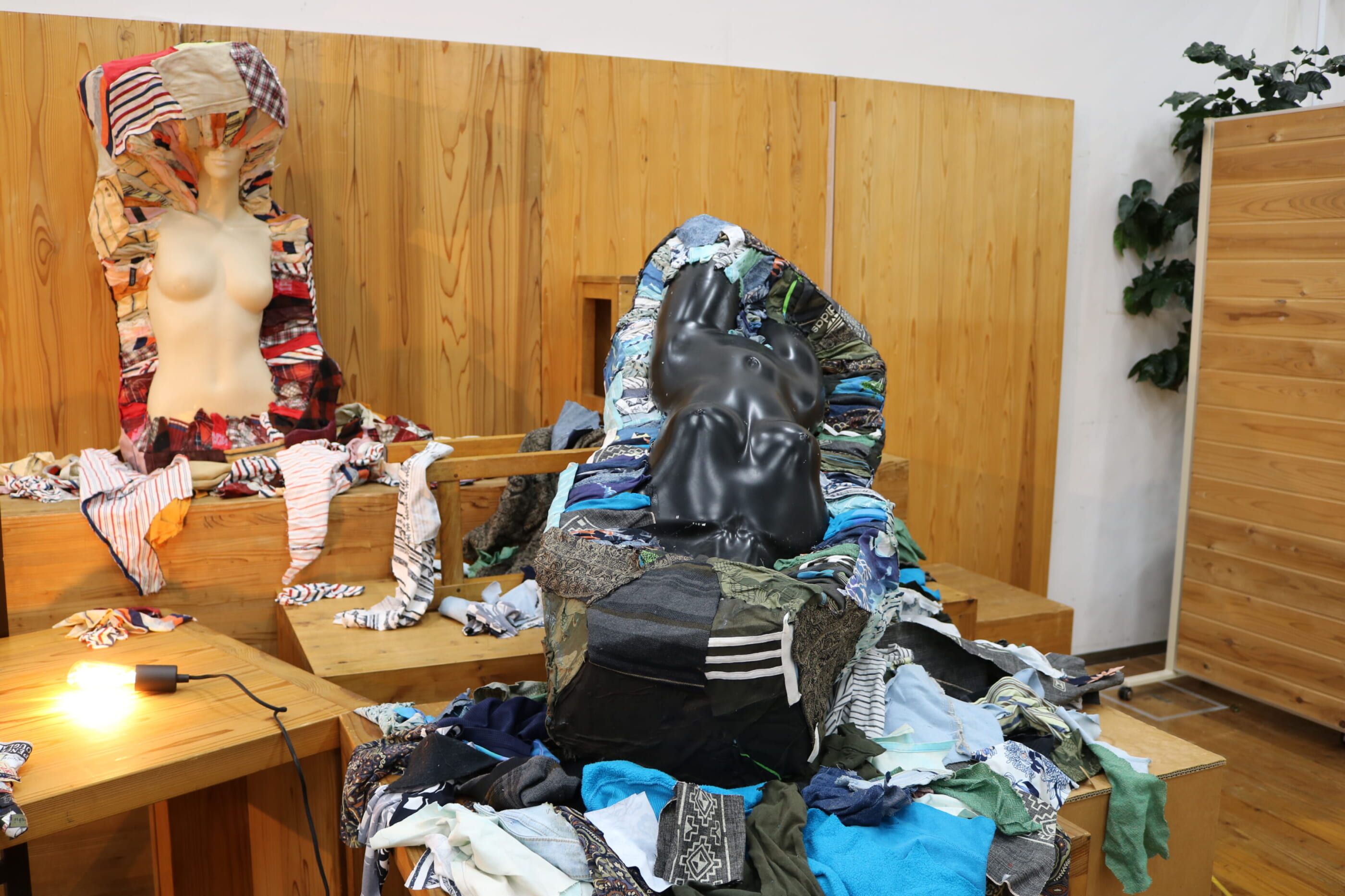 流行の移り変わりや、ネットショッピングなどによる消費の活発化により、衣類やコスメなどはその需要以上に大量に生産・廃棄されています。その大量の廃棄品の新たな表現は可能なのかを探ることで生まれた作品を展示します。