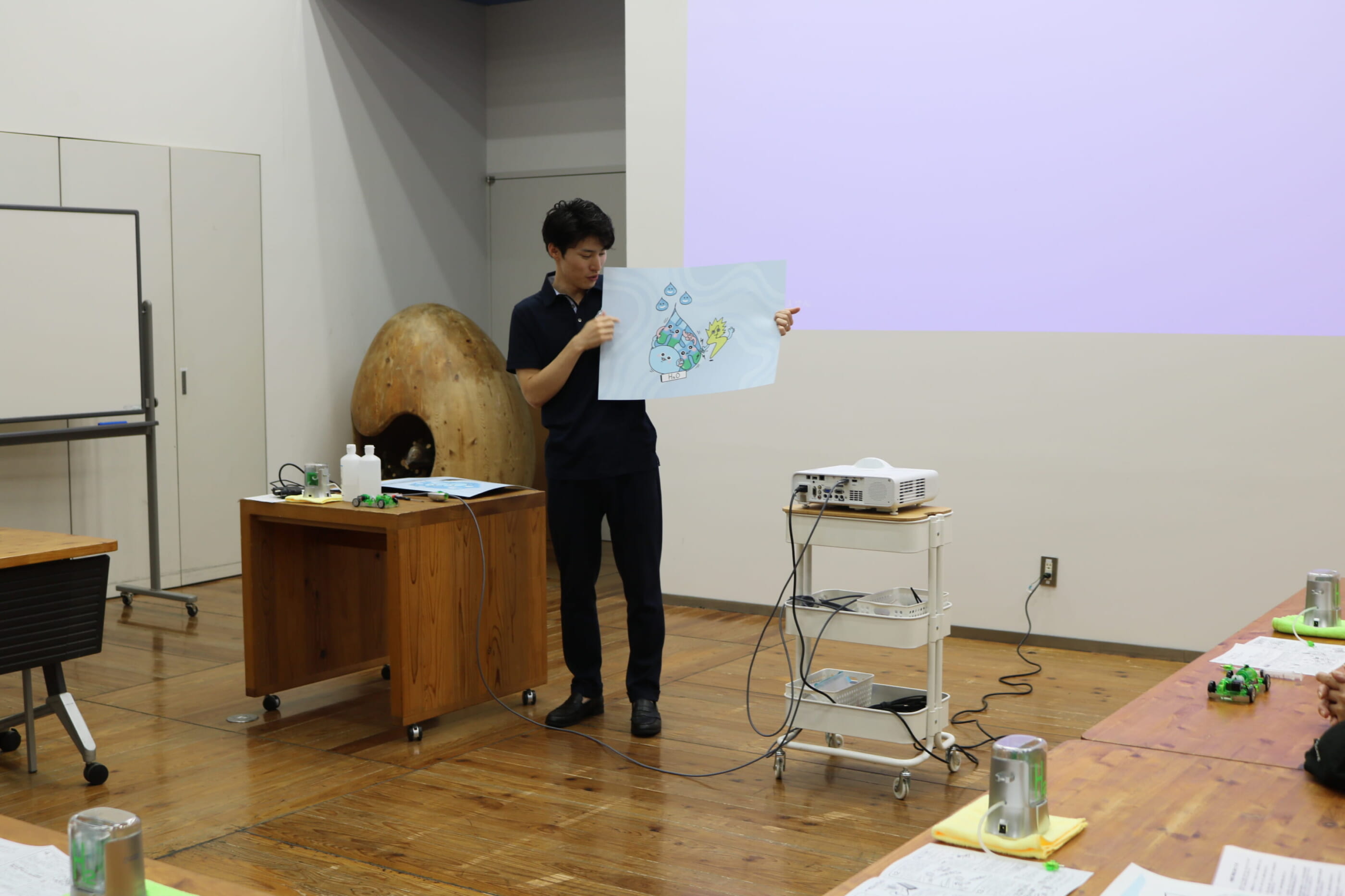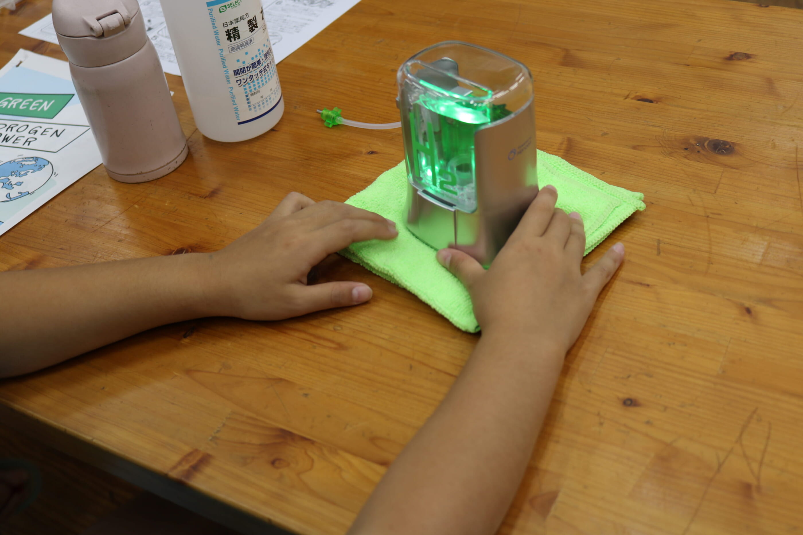 フィンランドのユバスキュラ市でカーボンニュートラルの推進を目指し、グリーン水素エネルギーの促進を行っている講師より、その取組についての説明がありました。フィンランドは気温が低いため、アパートの各部屋にサウナが付いており、薪で火を焚く機会も多く、これらが温室効果ガスの排出要因となっており、グリーン水素が活躍する場面が多くあるそうです。続いて、ユバスキュラ市で行われた展示の一部が紹介されました。化石燃料に代わるより環境に優しい代替手段としてグリーン水素の生産を加速させることの必要性が説明されていました。最後に、水素を作り、ラジコンカーに充てんさせて走らせました。参加者からは「水素の充てんに時間を要しない点は驚きだった」「すいそでくるまがうごいてすごかった」などの感想がありました。外国の環境への取組を知り、環境に優しいエネルギーについて学ぶ機会となりました。
