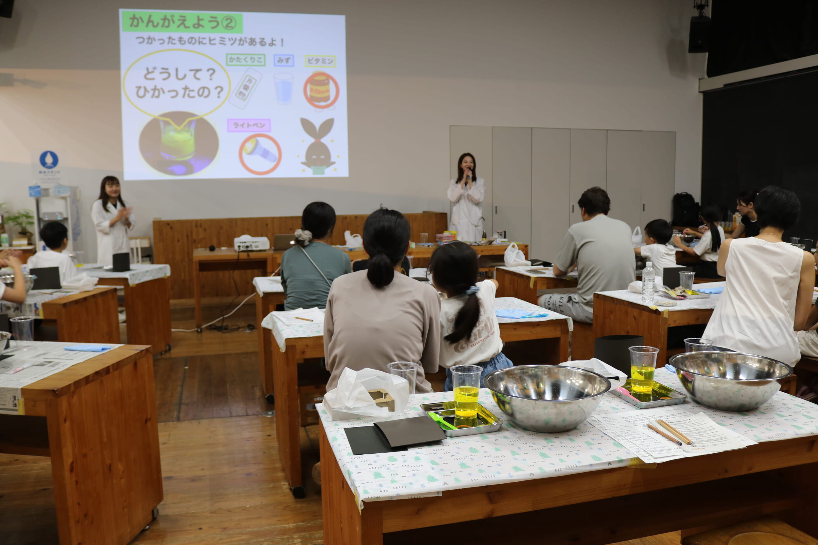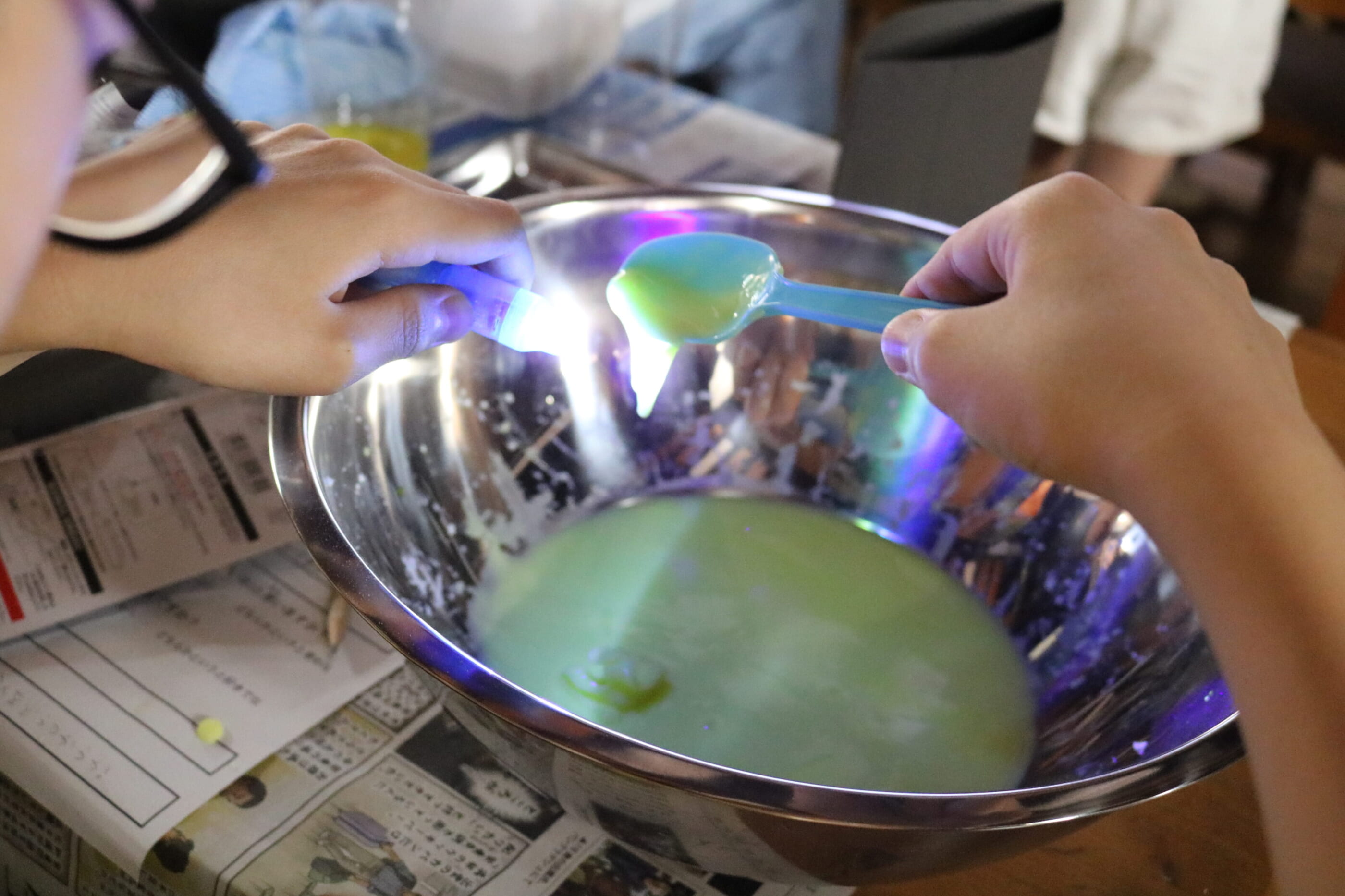 片栗粉、ビタミンサプリメント、水を使用してスライム作りを行いました。片栗粉は昔は「カタクリ」という花の球根から作られていましたが、現在はじゃがいものデンプンを使って作られているそうです。力を加えると固くなり、ゆるめるとやわらかくなる片栗粉の特性による独特なスライムの触感を楽しみ、ブラックライトを当てて光ることを確認しました。光る秘密はビタミンサプリメントに含まれるビタミンB2です。口の粘膜を守り、成長促進の働きがある大切な栄養素です。不足すると口内炎や貧血の一因にもなると説明がありました。 また、紫外線が及ぼす私たちの生活や植物への影響について学びました。自動車や工場から出る排気ガスに紫外線が当たると光化学スモッグ現象が起こり、目やのどが痛くなるだけではなく、植物が枯れたり野菜の収量が減少するそうです。そのため環境を守ることが大切であり、私たちができることとして、車を止める時はエンジンを止めて排気ガスを出さないことや、エアコンの温度を適正にすること、繰り返し使用可能なものや自然由来の製品を選択することなどが挙げられました。